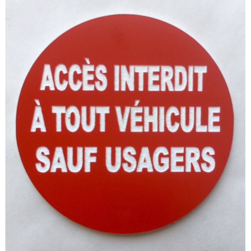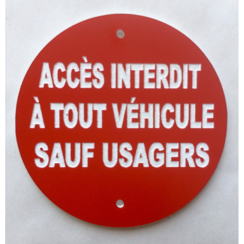 Panneau rond de signalisation Panneau rond ACCÈS INTERDIT À TOUT VÉHICULE SAUF RIVERAINS 8,98 € Panneau circulaire ACCÈS INTERDIT À TOUT VÉHICULE SAUF RIVERAINS diamètre 150, 200 ou 300 mm Ajouter au panier