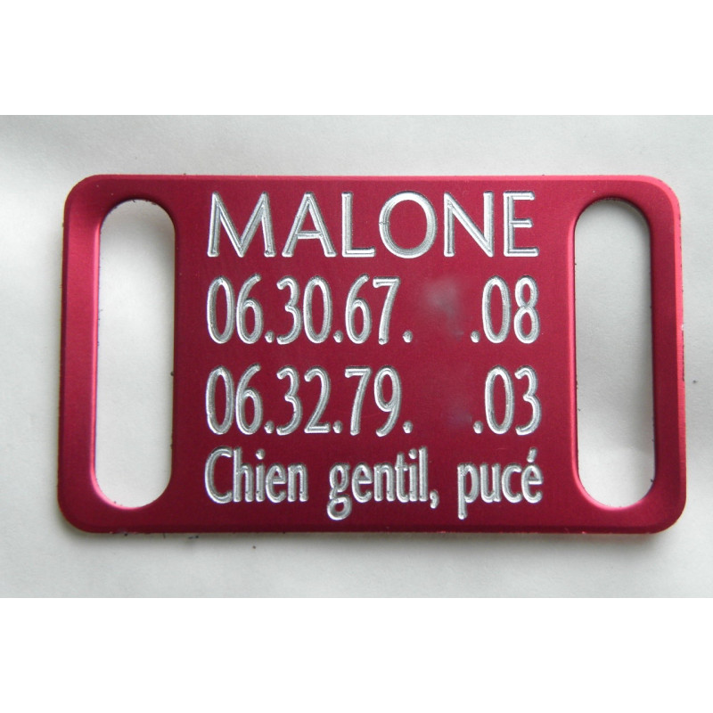 Plaque identification pour Chien en aluminium à glisser sur le collier,dimensions 52x30 mm pour collier à trous de largeur maxi 24 mm et 4 mm d'épaisseur.