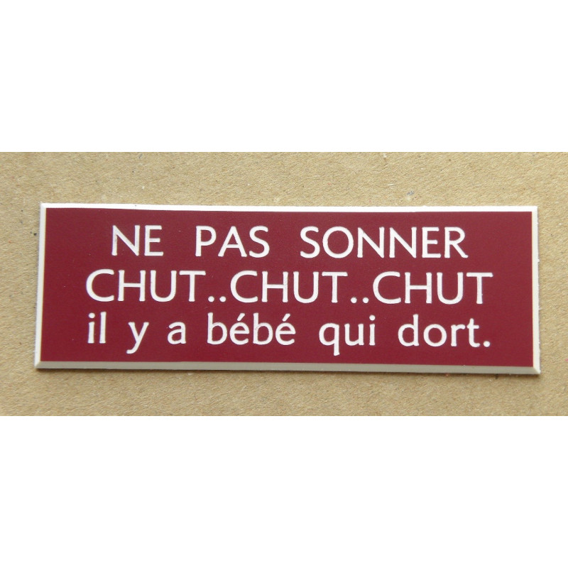 Plaques Humoristiques étiquette "NE PAS SONNER CHUT, CHUT CHUT il y a des bébés qui dorment" format 25 x 75 mm 4,95 € plaque adhésive "NE PAS SONNER CHUT, CHUT CHUT il y a des bébés qui dorment" 15 couleurs disponibles Ajouter au panier